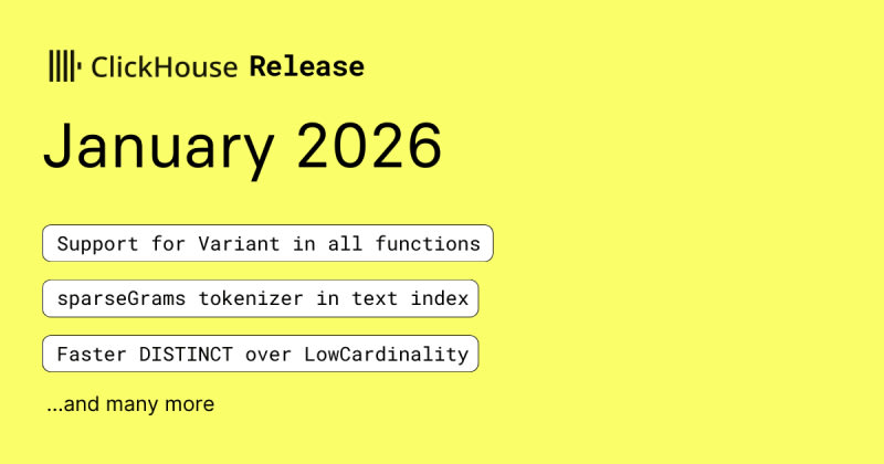 ClickHouse 26.1 brings 25 new features, 43 performance optimizations, and 176 bug fixes. Key improvements include end-to-end deduplication for asynchronous inserts with materialized views, new indexing projection syntax, faster DISTINCT operations on LowCardinality columns, and enhanced introspection tools for MergeTree tables