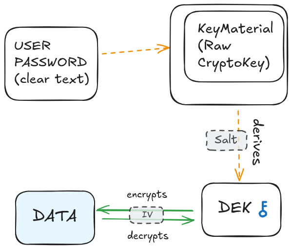 This tutorial demonstrates implementing client-side encryption by storing salts on the backend and Data Encryption Keys (DEK) in localStorage. It covers generating initialization vectors (IVs) for AES-GCM encryption, converting CryptoKey objects to base64 for storage, and encrypting/decrypting data with proper IV handling. The