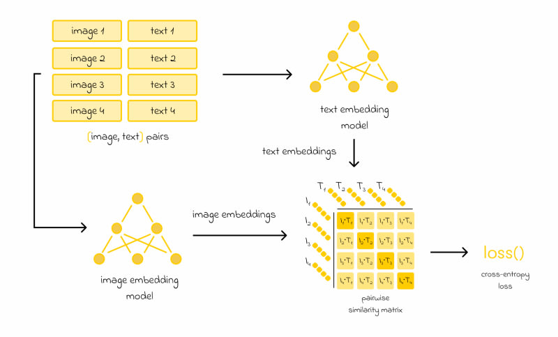 CLIP is a multimodal AI model developed by OpenAI that uses contrastive learning to create meaningful embeddings for both images and text. Trained on 400 million image-text pairs, it employs separate embedding models for text (Transformer-based) and images (ResNet or Vision Transformer) to learn representations where similar