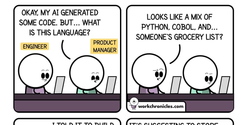 A humorous comic strip that satirizes the gap between AI marketing claims of 'state-of-the-art' performance and the actual quality of AI-generated outputs that developers encounter in practice.