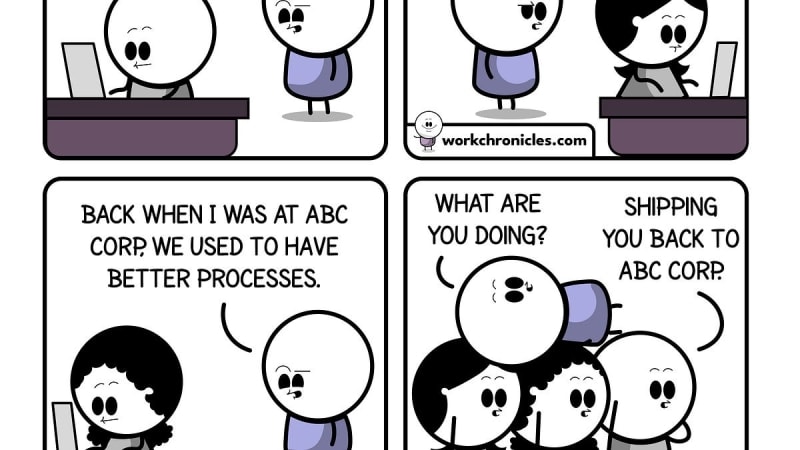 A comic illustrating the common workplace behavior where employees frequently reference how things were done at their previous organization, often as a way to critique or compare current practices. The humor highlights the tension this creates in teams and the irony that the same people may repeat this pattern when they move to yet another company.