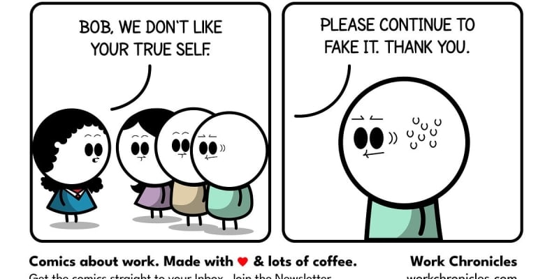 A comic strip that humorously depicts the importance of bringing one's true self to work, created by Work Chronicles. The content aims to address common workplace issues and promote authenticity in a lighthearted manner.