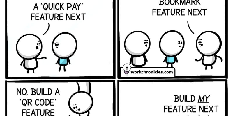 A workplace comic illustrating the common scenario where different stakeholders compete for priority in the product development queue, highlighting the challenges of feature prioritization and stakeholder management in software teams.