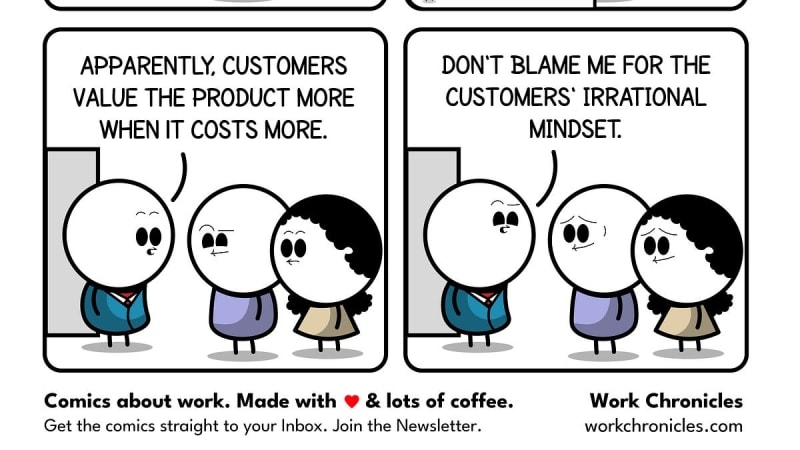 A comic strip illustrating the gap between customer-centric rhetoric and actual decision-making in workplace environments. The humor highlights common organizational dynamics where customer needs are discussed but not necessarily prioritized in practice.