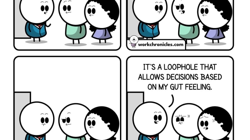 A humorous comic illustrating the tension between data-driven decision making and intuition in the workplace. The comic explores how teams sometimes selectively use or ignore data to justify predetermined decisions, highlighting a common workplace dynamic where data analysis can be manipulated to support existing biases rather than inform genuine decision-making.