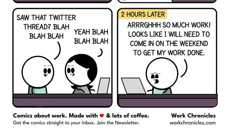 A comic strip about the relatable workplace experience of being called in for an 'emergency' weekend work session, part of the Work Chronicles series of work-life comics.