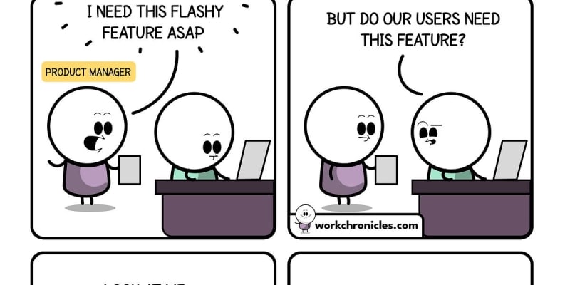 A workplace comic illustrating the common scenario where team members claim to represent the user perspective during product development discussions. The comic humorously captures the dynamics of product decision-making and user advocacy in software teams.