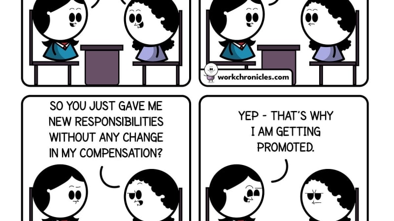 A workplace comic strip about the dynamics of promotions and stretch assignments, humorously depicting how these career development tools are often used in practice. The comic resonates with readers who have experienced or witnessed the gap between how stretch assignments are framed versus how they actually function.