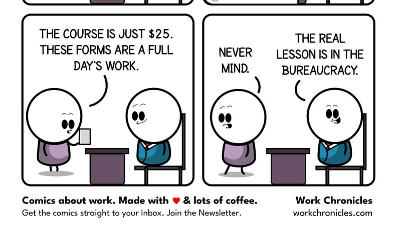 A comic strip from Work Chronicles about the cost of learning in a work context. The actual comic content is not available in the provided text, but the series focuses on workplace humor and situations.