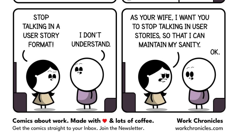 A comic strip from Work Chronicles about user stories in a work context, with minimal extractable technical content beyond the title and site description.