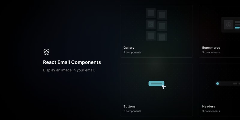 Pre-built components for building email templates using React. The list includes components for various sections like gallery, e-commerce, articles, buttons, headers, footers, code blocks, grid layouts, images, links, and more, aimed at simplifying the design process.