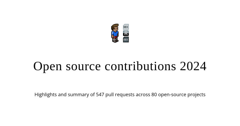 A developer shares their 2024 open source contribution highlights, including 547 merged pull requests across 80 projects in the PHP ecosystem. Major achievements include implementing type inference for regular expressions in PHPStan, adding side-effects detection to PHPUnit, and introducing @param-out and