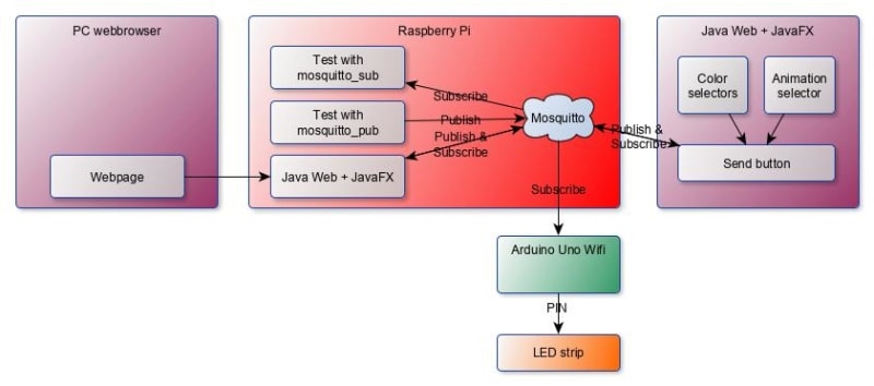 A project demo showing how to control an Arduino-driven LED strip wirelessly using a JavaFX application and Mosquitto message queue running on a Raspberry Pi. The setup includes a color picker UI, a command log table, and a web interface served via Undertow. Commands are exchanged between all components through the Mosquitto queue, keeping them decoupled. Source code for both the Java and Arduino sides is available on GitHub, and the full walkthrough is covered in the book 'Getting Started with Java on the Raspberry Pi'.