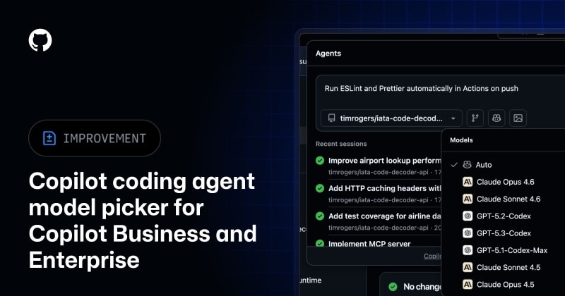 GitHub has expanded the model picker for Copilot coding agent to Business and Enterprise users, following its December 2025 launch for Pro and Pro+ subscribers. Users can now select from multiple models including Claude Opus 4.5/4.6, Claude Sonnet 4.5/4.6, and several GPT-5 Codex variants when delegating tasks to the autonomous