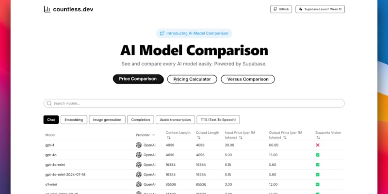 Countless.dev is a newly launched open-source platform designed for developers to compare various AI models and determine the best one for their needs. Featured on December 7th, 2024, it aims to assist in making informed decisions about AI model selection.