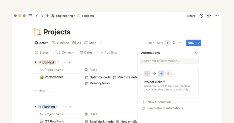 How database automations save time and let you focus on the bigger pictureSet up workflows for your tasks and projectsThree automations for Notion ProjectsAutomate complexity away with formulasMore database automations for all your workSort: