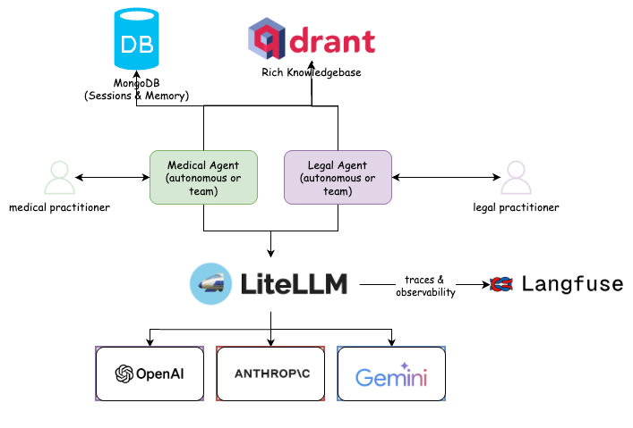 A technical implementation guide for building memory-efficient AI agents specialized for medical and legal domains. The architecture separates short-term conversational state in MongoDB from long-term semantic knowledge in Qdrant vector database, orchestrated through the Agno framework. The system uses LiteLLM for