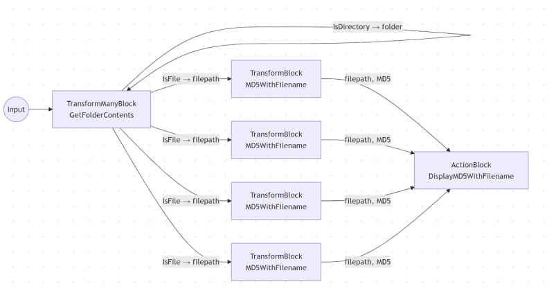 TPL Dataflow enables recursion through graph structure rather than explicit method calls by linking a block's output back to its own input using predicates. A TransformManyBlock can process directory entries, routing subdirectories back to itself while forwarding files to downstream processing blocks. This approach provides