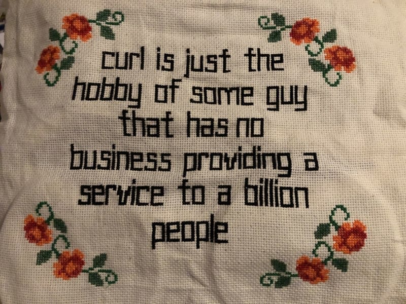 The post discusses how curl is not just a hobby for the author, but also their full-time job. It mentions a cross-stitch pattern inspired by curl and an ad with a curl command in San Francisco. It also includes a quote explaining the thinking behind the ad.