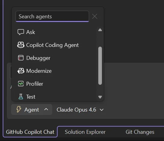Visual Studio is shipping a set of built-in preset agents (Debugger, Profiler, Test, Modernize) that integrate deeply with IDE tooling, plus a custom agent framework in preview. Custom agents are defined as `.agent.md` files in `.github/agents/` and can connect to external knowledge sources via MCP—enabling use cases like