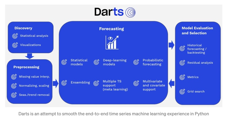 Darts is a Python library designed to simplify time series processing and forecasting. It offers a unified and consistent API for data manipulation, model fitting, forecasting, and backtesting, making it easier to switch between models without compatibility issues. Darts supports various models, including traditional methods
