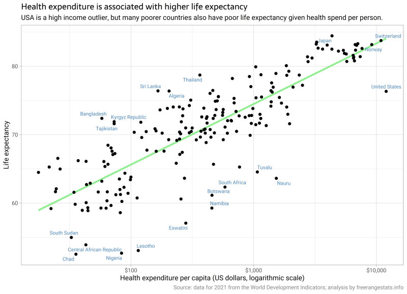 The post discusses the disparities in life expectancy relative to health expenditure across different countries, highlighting that the USA has low life expectancy despite high health spending. It underscores that factors such as malnutrition, obesity, poor housing, unsafe water, and high rates of suicide and violent deaths