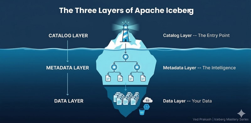 A detailed breakdown of Apache Iceberg's three-layer architecture: the Catalog Layer (thin pointer to current metadata, enabling atomic commits), the Metadata Layer (metadata files, manifest lists, and manifest files enabling hierarchical query pruning), and the Data Layer (open-format Parquet files in cloud object storage).