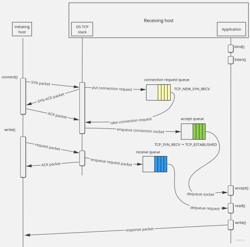 TCP is a programming construct used in the Linux kernel source code. It’s an abstraction over how Linux communicates with other hosts distributed over a network. The process of connection creation in TCP is called the three-way handshake. After an ack packet has arrived, connection request is removed from a connection request queue.