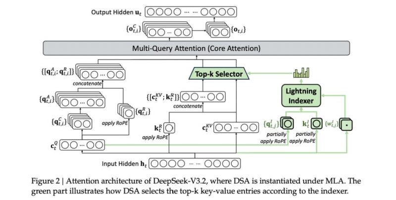 DeepSeek V3.2 introduces DeepSeek Sparse Attention (DSA), reducing attention complexity from O(L²) to O(Lk) by using a Lightning Indexer to select only the top 2,048 relevant tokens per query, regardless of context length. This achieves 2-3x cost reduction for long-context inference (128K tokens) while maintaining or improving