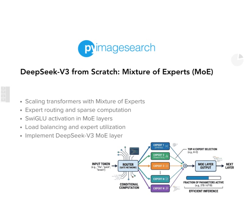 DeepSeek-V3 from Scratch: Mixture of Experts (MoE)The Scaling Challenge in Neural NetworksMixture of Experts (MoE): Mathematical Foundation and Routing MechanismSwiGLU Activation in DeepSeek-V3: Improving MoE Non-LinearityShared Expert in DeepSeek-V3: Universal Processing in MoE LayersAuxiliary-Loss-Free Load Balancing in DeepSeek-V3 MoESequence-Wise Load Balancing for Mixture of Experts ModelsExpert Specialization in MoE: Emergent Behavior in DeepSeek-V3Implementation: Building the DeepSeek-V3 MoE Layer from ScratchMoE Design Decisions in DeepSeek-V3: SwiGLU, Shared Experts, and RoutingMoE Computational and Memory Analysis in DeepSeek-V3MoE Expert Specialization in Practice: Real-World BehaviorTraining Dynamics of MoE: Load Balancing and Expert UtilizationMixture of Experts vs Related Techniques: Switch Transformers and Sparse ModelsSummarySort: