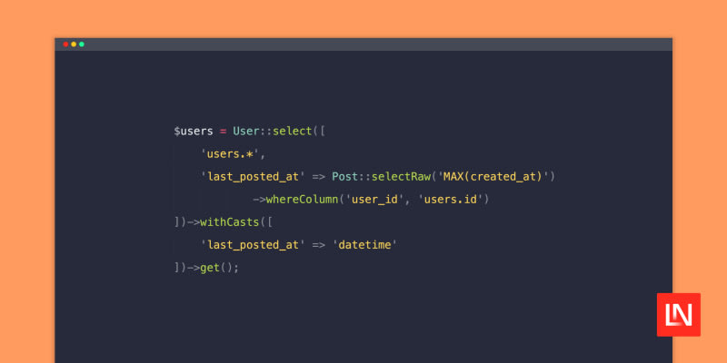 Laravel allows you to define casts at the model level to handle casting values to their native types. You can use the method to define a cast at query time, giving you the power of complex queries yet still using casts. If you'd like to learn more about casts, check out Eloquent Attribute Casting and Elquent Custom Casts.