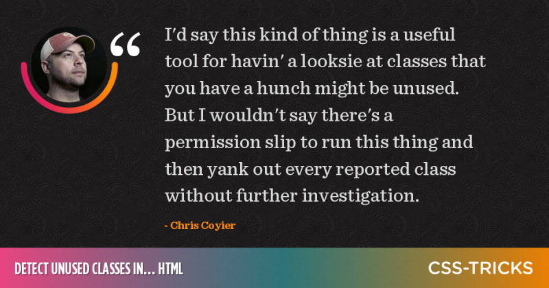 Unused CSS is a hard problem because of how hard it is to know for sure know if a ruleset is unused. Robert Kieffer's solution is to load up document.styleSheets and find all the rules (the ones that are classes) Then, use a MutationObserver to watch the DOM for all HTML. If the HTML has a class not found in a stylesheet, report it.