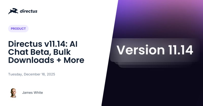Breaking ChangesAI Chat Sidebar (Beta)Bulk File and Folder DownloadsHeader Interface: Organize Your FormsExternal JWT Validation: Integrate With Your Existing IAM InfrastructureOther ImprovementsDirectus v11.14 is Available NowSort: