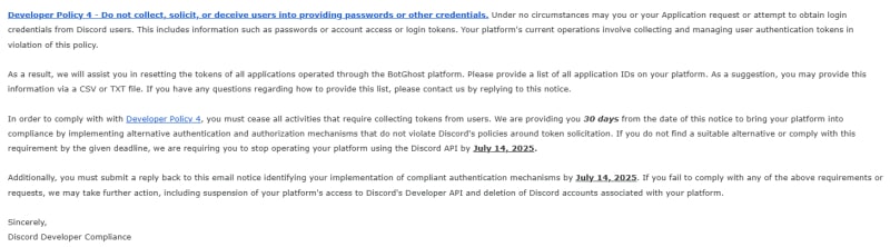 Discord has issued BotGhost, a no-code Discord bot builder with 3+ million users, an ultimatum to stop using bot tokens by July 14, 2025, or face shutdown. BotGhost argues they operate as a legitimate service provider under Discord's terms, similar to platforms like MEE6 and Dyno. The dispute arose after security