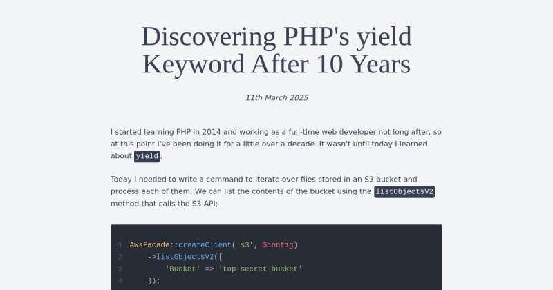 Explains PHP's yield keyword and how it can be used instead of return to simplify building iterators. Highlights practical tips and its applications in modern PHP development, particularly with Laravel.