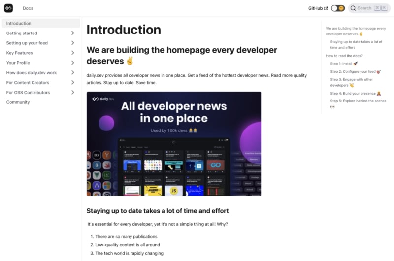 Built with Docusaurus. 100% Open Source. Check out the repo: https://github.com/dailydotdev/docs. Dark/Light modes. Search (powered by Algolia) Search is powered by AlGolia. The official daily.dev product docs: http://www.daily.dev/product/daily-dev-product-doc.