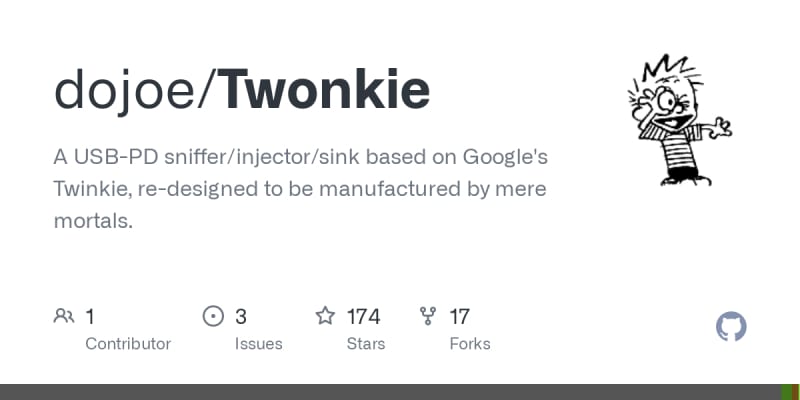 Twonkie is a USB-PD sniffer/injector/sink based on Google's Twinkie, redesigned for easier manufacturing for hobbyists. Its design utilizes a four-layer PCB and standard leaded parts, making it more accessible compared to the original Twinkie. Twonkie v2.0 supports higher bus voltages suitable for Extended Power Range (EPR),