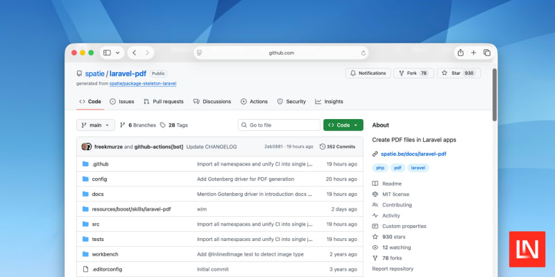 Spatie's laravel-pdf v2 introduces a driver-based architecture that lets developers choose between multiple PDF generation backends: Browsershot (Chromium via Puppeteer), Cloudflare Browser Rendering API, DomPdf (pure PHP), and Gotenberg (Docker-based). The release adds queued PDF generation with callbacks, PDF metadata support