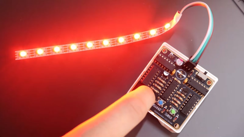 A hardware project demonstrates driving WS2812B addressable LEDs using only discrete logic ICs, with no microcontroller involved. A 74HC14 Schmitt trigger oscillator generates an 800 kHz clock, while a phase-shifted AND gate produces the shorter pulses for logic zero. A binary counter cycles through 24 bits for RGB color data,