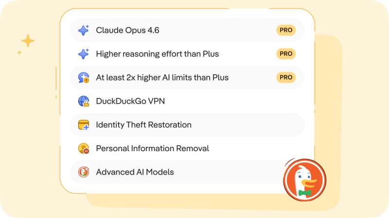 DuckDuckGo has launched a new Pro subscription tier at $19.99/month or $199.99/year, sitting above the existing Plus plan ($9.99/month). The Pro plan offers three Duck.ai upgrades: 2x higher usage limits compared to Plus (covering text chat, voice chat, and image generation), exclusive access to Claude Opus 4.6, and extended