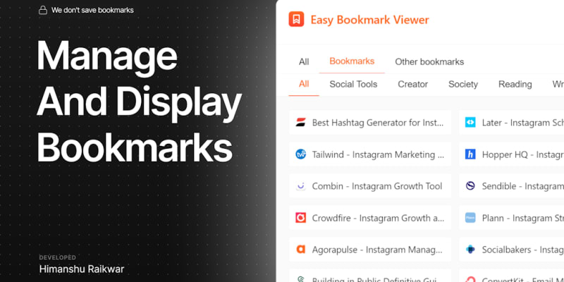 Easy Bookmark Viewer, launched on September 4th, 2024, is a tool designed to help users manage and display their bookmarks. It falls under the categories of Productivity, Developer Tools, and Tech. This is its first launch.