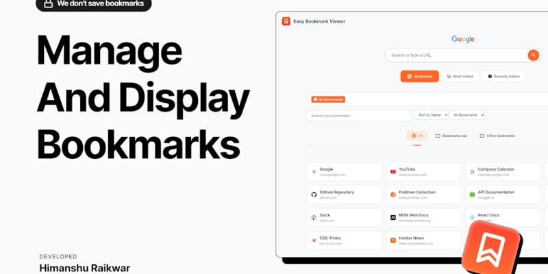 Easy Bookmark Viewer is a Chrome extension that replaces the default new tab page with a visual dashboard for managing bookmarks. It offers a grid layout, instant search functionality, and smart sorting to help users organize and access their bookmarks more efficiently than Chrome's standard text-based bookmark lists.