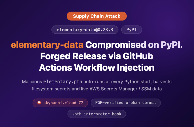 A malicious version of the elementary-data Python package (0.23.3) was published to PyPI on April 24, 2026, via a GitHub Actions script injection attack. The attacker exploited a vulnerability in the project's own CI workflow, used the GITHUB_TOKEN to forge a signed release commit, and triggered the legitimate publishing pipeline — without touching the main branch. The compromised release includes a .pth file that executes a three-stage credential-stealing payload on every Python invocation. The same workflow also pushed a trojaned multi-arch Docker image to GHCR tagged as both 0.23.3 and latest. The payload harvests SSH keys, cloud credentials (AWS, GCP, Azure), Kubernetes configs, .env files, crypto wallet keys, and more, exfiltrating everything to an attacker-controlled endpoint.