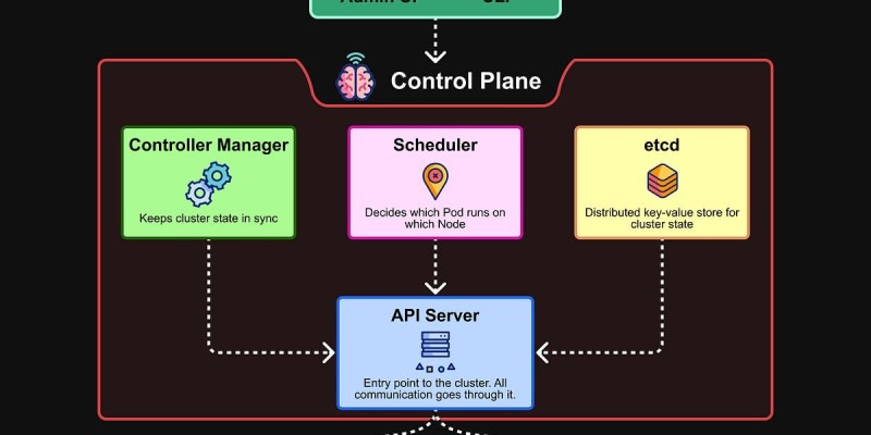 Kubernetes fundamentals are explained including control plane components (API Server, Scheduler, Controller Manager, etcd) and worker nodes (Pods, Container Runtime, kubelet, kube-proxy). Docker best practices cover using official images, specific versions, multi-stage builds, .dockerignore, least privileged users, environment