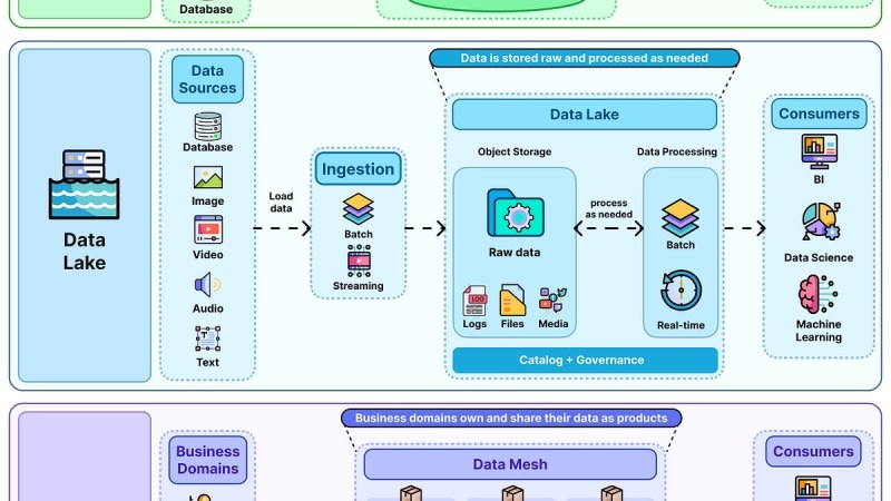 A newsletter covering several system design topics. The main focus is a comparison of three data architecture approaches: data warehouses (structured, schema-first, fast queries), data lakes (raw storage, flexible but prone to chaos without governance), and data mesh (decentralized ownership by domain teams, suited for larger orgs). Additional sections cover API design concepts (REST, GraphQL, gRPC, security, reliability), four server-update patterns (polling, long polling, SSE, webhooks), and the distinction between SLI, SLO, and SLA in service reliability.