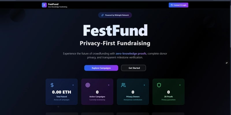 FestFund is a fundraising platform that uses zero-knowledge proofs to enable private donations while maintaining public transparency. Built on Midnight Network, it allows donors to contribute anonymously while still providing verifiable leaderboards and milestone tracking. The platform reduces ZK proof generation time from