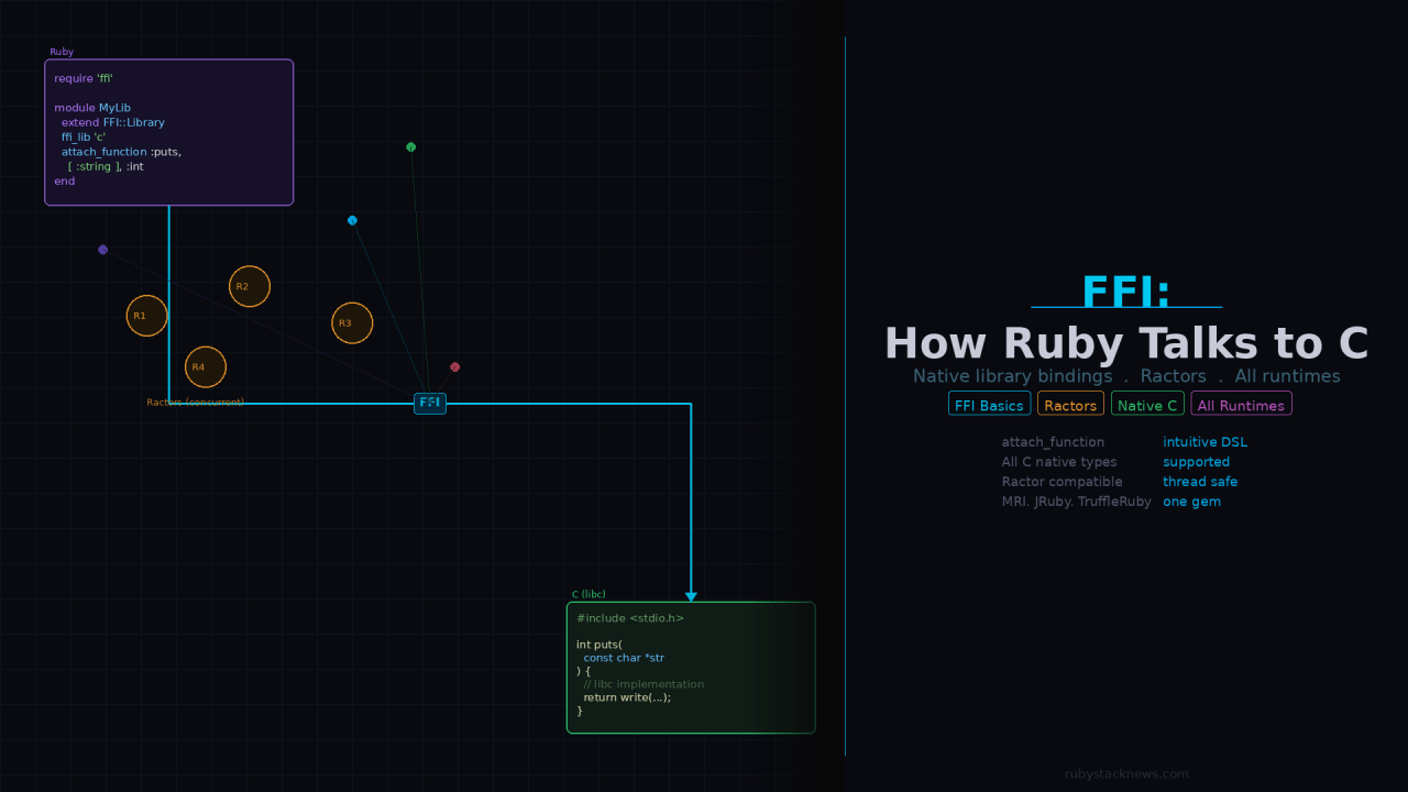 The two pathsPath 1: FFI gemInstallationBasic usageThe type systemA real example: binding libmStructsCallbacks from C to RubyFFI with RactorsPath 2: C extensionThe Ruby C APIWrapping a C struct as a Ruby objectThe extconf.rbChoosing between FFI and C extensionWhat becomes possibleShare this:RelatedSort: