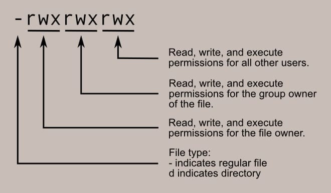 File permissions determine how users on the system can interact with the various files available on it. Users in Linux are divided into logical structures called groups. The number after them is the amount of links to the file/directory. The name after it is the group of the owning users. The first group describes the