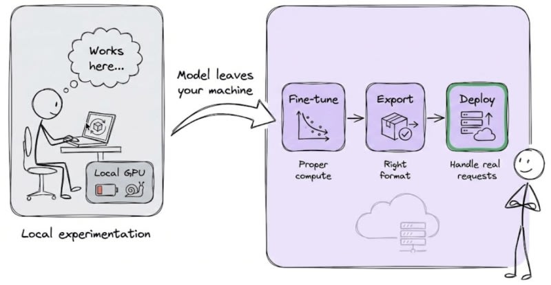 A step-by-step workflow for fine-tuning and deploying large language models using cloud GPU infrastructure. The process covers launching a GPU instance on RunPod, loading a 20B parameter model with Unsloth's memory optimizations, applying LoRA adapters for efficient training, running supervised fine-tuning, exporting the merged