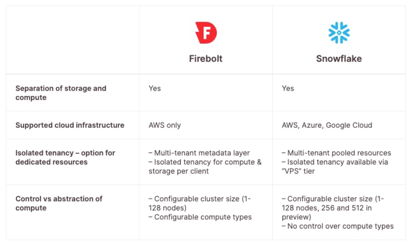 Firebolt is built on a natively decoupled storage & compute architecture, on AWS only. Data has to be copied outside of your VPC into the Firebolt, where both your compute and data run in a dedicated and isolated tenant. Snowflake has recently added support for Snowflake managed Iceberg tables.